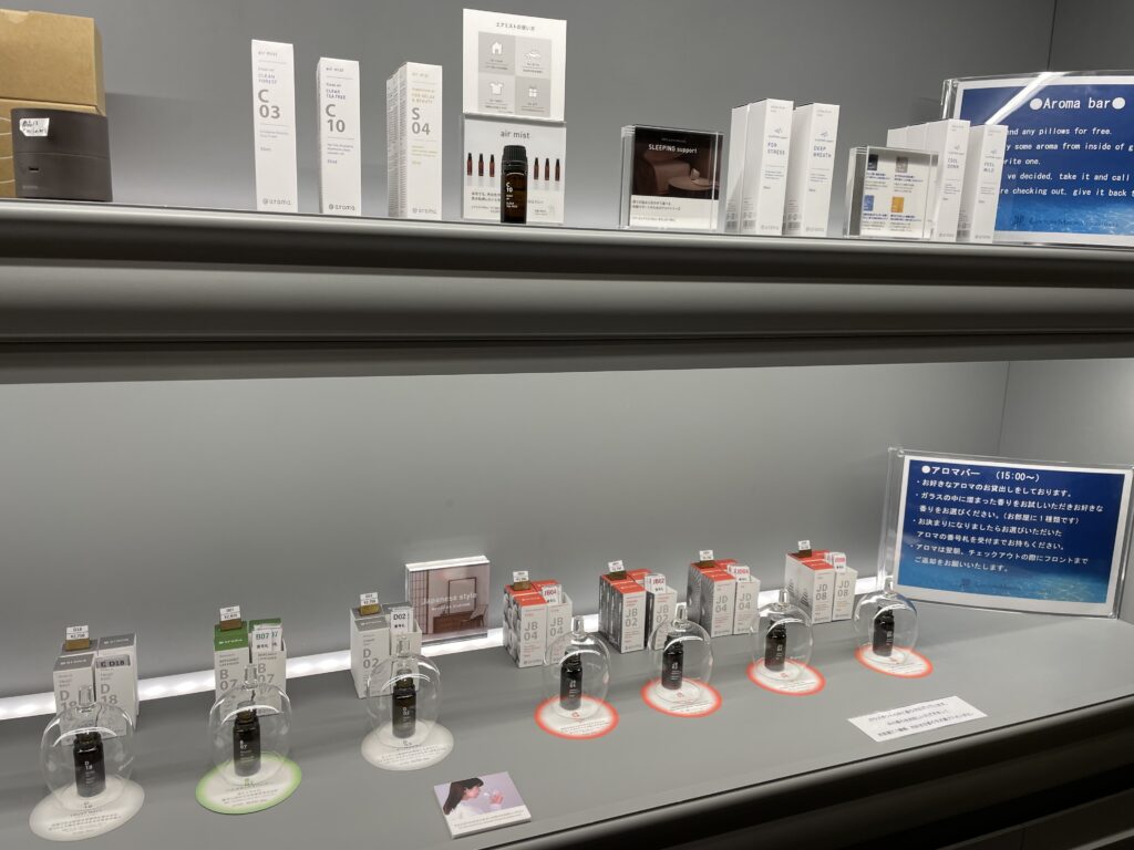 2階では、好みに合わせて選べる枕セレクトやアロマフレグランスのセレクトがあり、自分好みの空間を作れます。